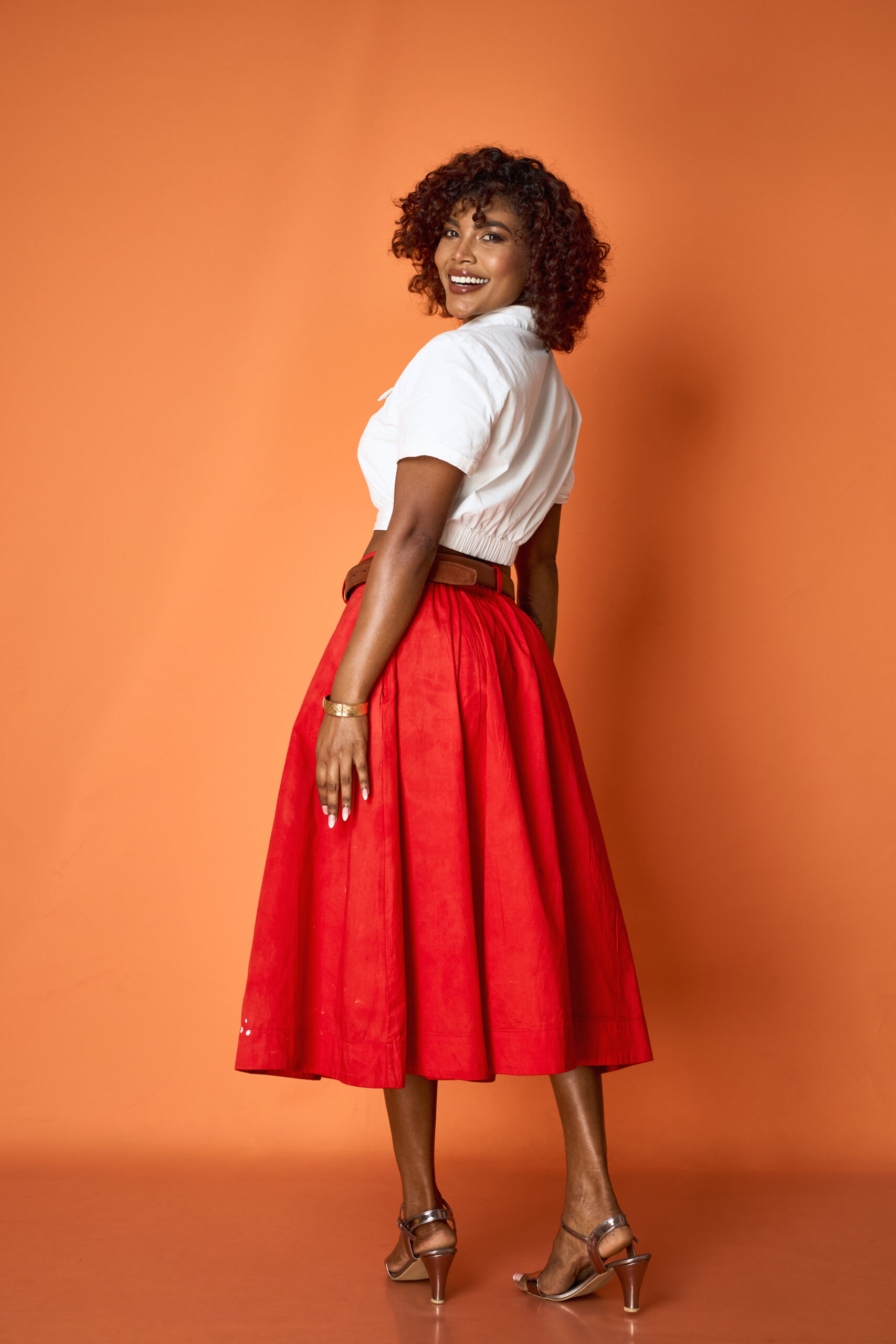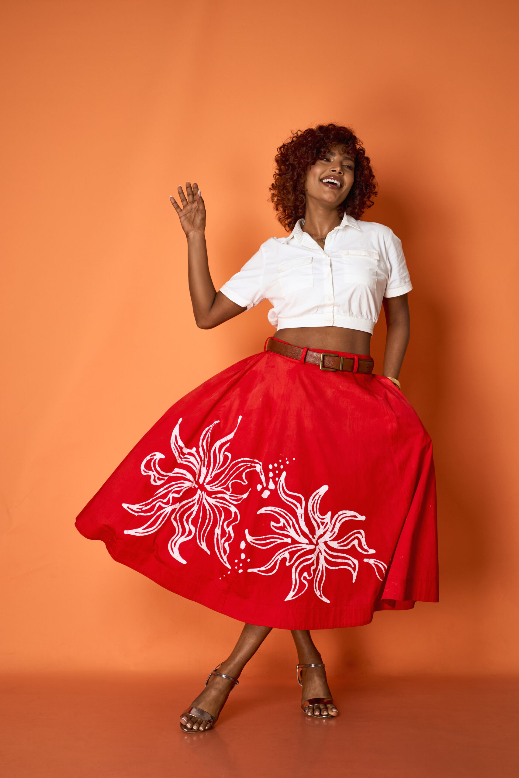 A bold and flowing full skirt with vibrant hues, perfect for twirling with effortless elegance.